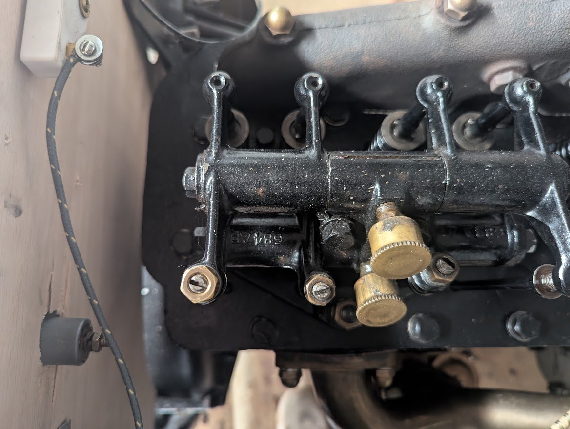 Your head is a model B, but rockers are for the racing model C. Roof modified the B rockers for the C. Upper tower was cut down on one side, and the shaft offset to one side to align with the C valves. Here is what the unmodified B rocker set looks like.