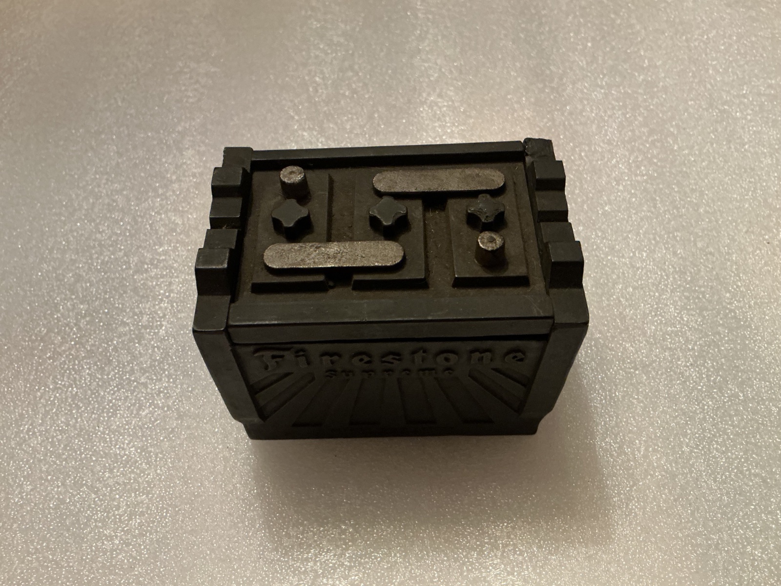 Perhaps sold or maybe just image items that Firestone dealers kept in their store fronts. Lid recess held matches.