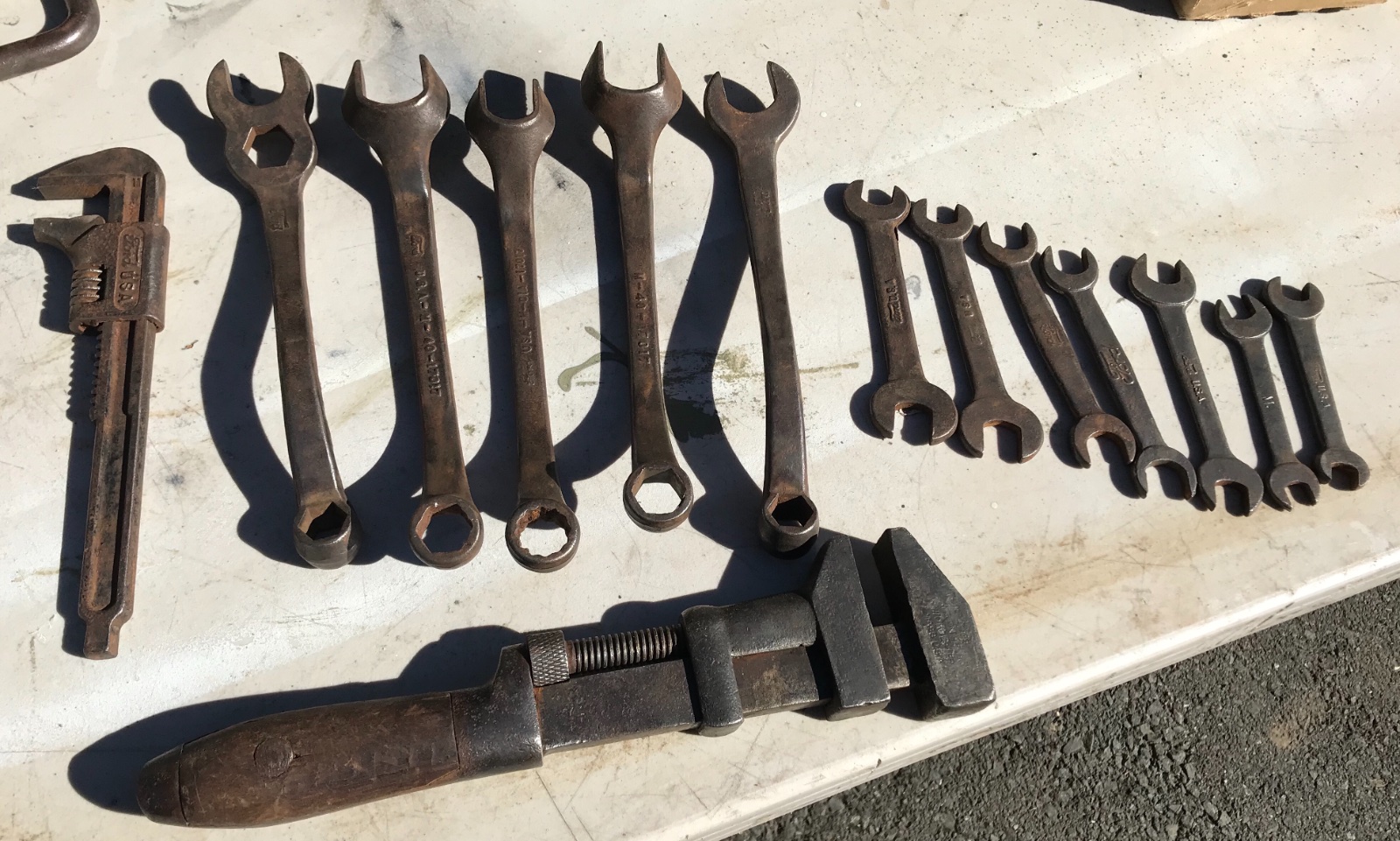 Of the little open end wrenches, the third and fourth from left look like T model band adjusting wrenches, T1917.