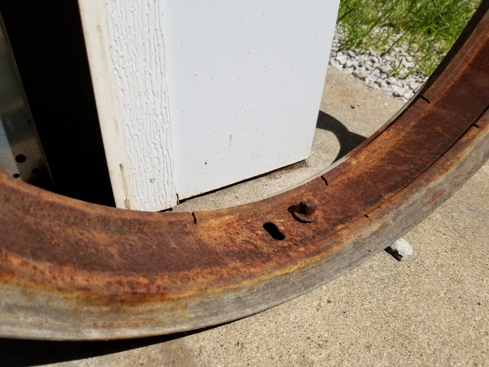There's always plenty of confusion over similar terms when this subject comes up. Matthew''s demountables are split RIMS. Notice that the rim is split all the way across. There is no separate ring. The holes are for the missing hardware that should hold the rim together. Forest's's picture shows a split RING. Notice that only the separate ring has a split, and there is no split in the rim. The split ring is the one that famously wants to kill you, and is often installed in a cage or with chain wrapped around it to prevent that misfortune.