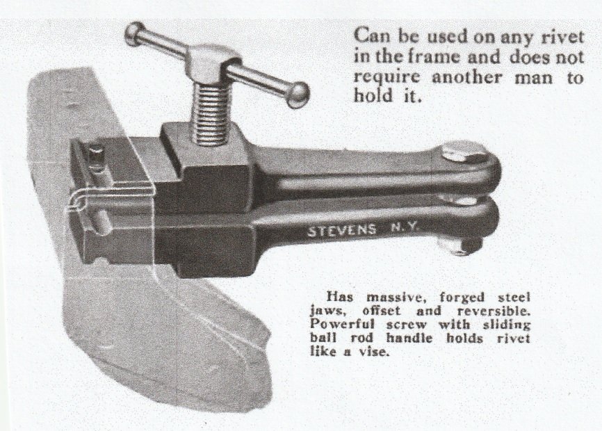 I recently saw the post about the frame riveting tool that sold on eBay and was curious if anyone has any information about the Stevens T-50 tool? It seems like a very helpful tool for our hobby. There was a picture of it from what looked like it came out of a catalog but most of the text was cut off and couldn't read the whole thing. I would also be interested in if any one knows where I could acquire a set of drawings/patent info for it or if you have some measurements. I have a thought of drawing one up in CAD and 3D printing it to cast a few sets.