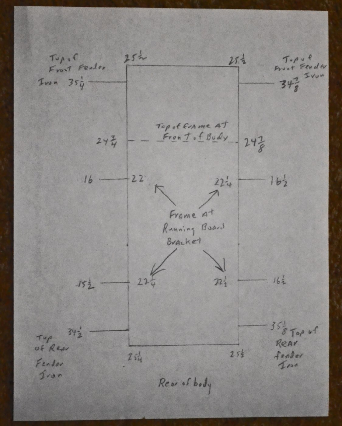 I decided to paint the fenders, running boards and splash aprons of my coupelet this winter to give me something to do. I have taken measurements of the frame and running board and fender irons and want opinions on what I should do. All measurements were to the ground.