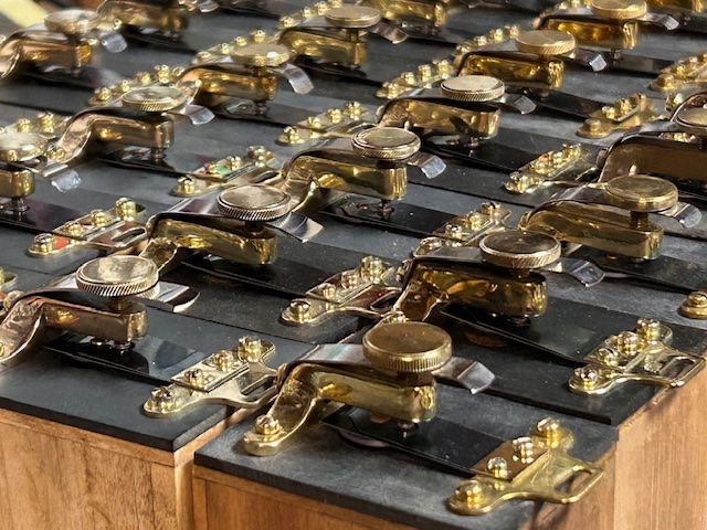 Tuning a batch of Kingston High Bridge. This model coil was used in Model T from 1909-1910. There are a few original coils in this batch and the rest are brand new coils. The brass bridge was cast and machined and new wood boxes made.