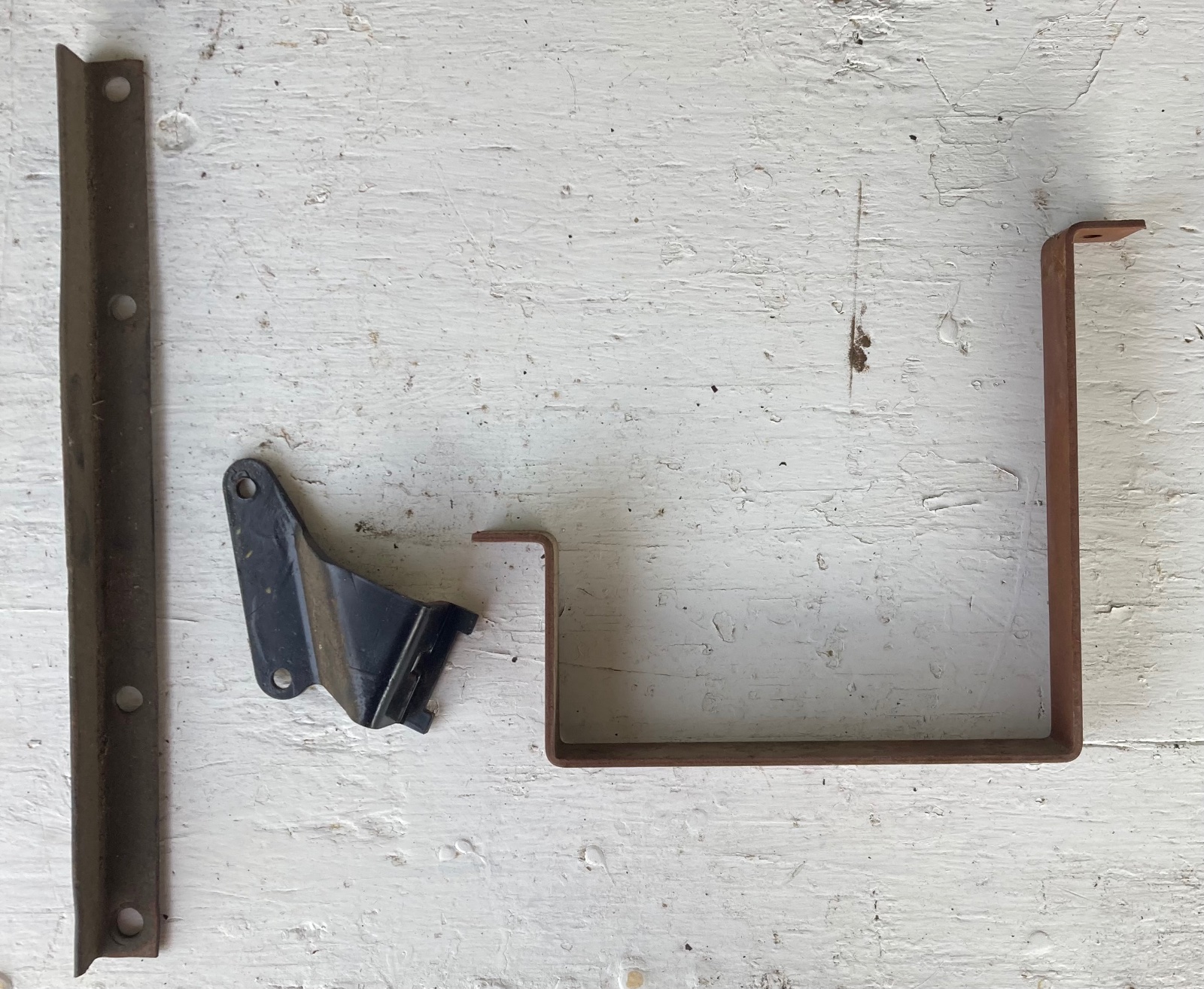 You need 5 pieces - all of which I think Snyders or Langs sell. One photo shows how they all fit together. There’s one angle iron with 4 holes. Outboard 2 bolt into the runningboard supports. Inboard 2 bolt to the 2 strap metal pieces. Other end of the strap metal pieces bolt to existing holes in the runningboard. Then you’ll fashion a wood base to fit in this strap metal cradle into which you’ll place your battery. Finally, theres 2 hard to find brackets that bolt into 2 holes (5/16”) pre drilled in the runningboard supports. I only picture one. If you can’t find these from the vendors, call Paul Ray Martin outside of Slaton……