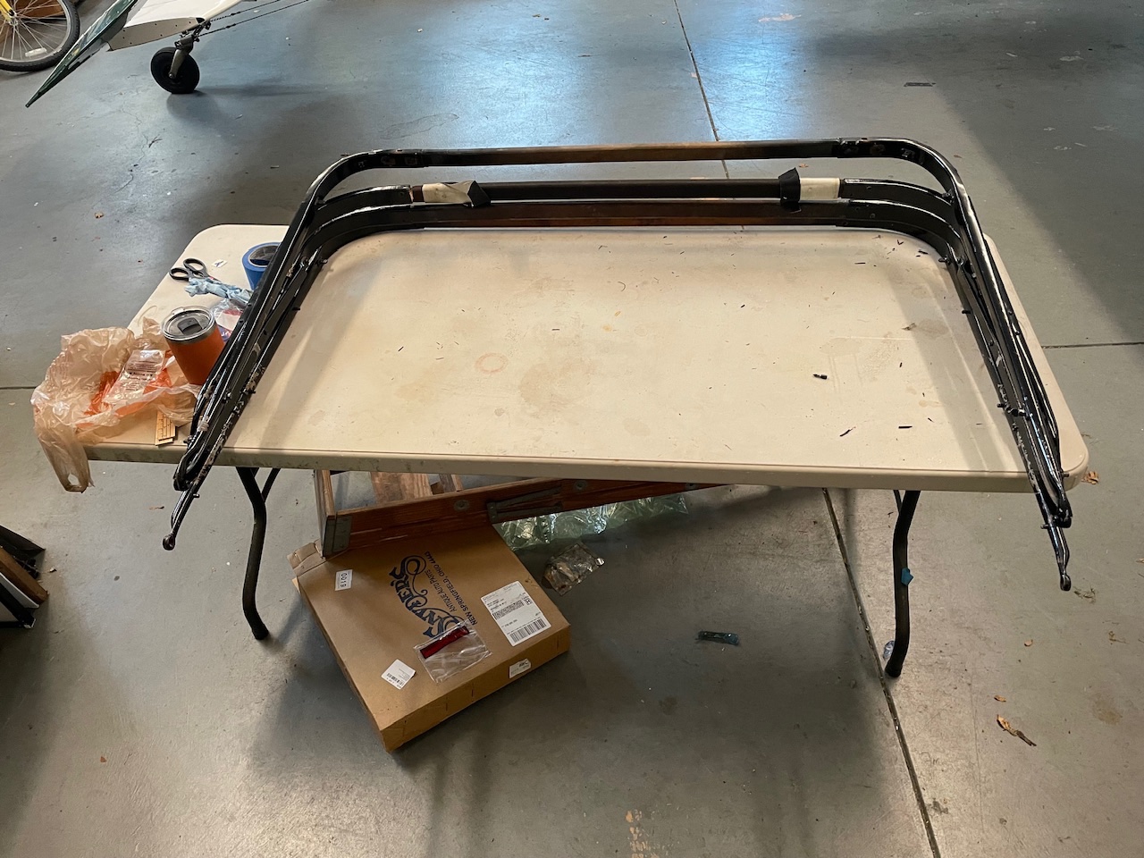 I got the top frame off the car today and removed the broken third bow. One thing I hadn’t noticed before is that the bows are slightly arched over their length, about 1/8” on the front and rear, and about 3/8” on the middle two. My plan was to buy some white ash stock and have a friend with a wood shop plane it to size and round over the edges. Since the third bow (counting from the rear) is nearly horizontal, would it even be noticeable if I left it straight?