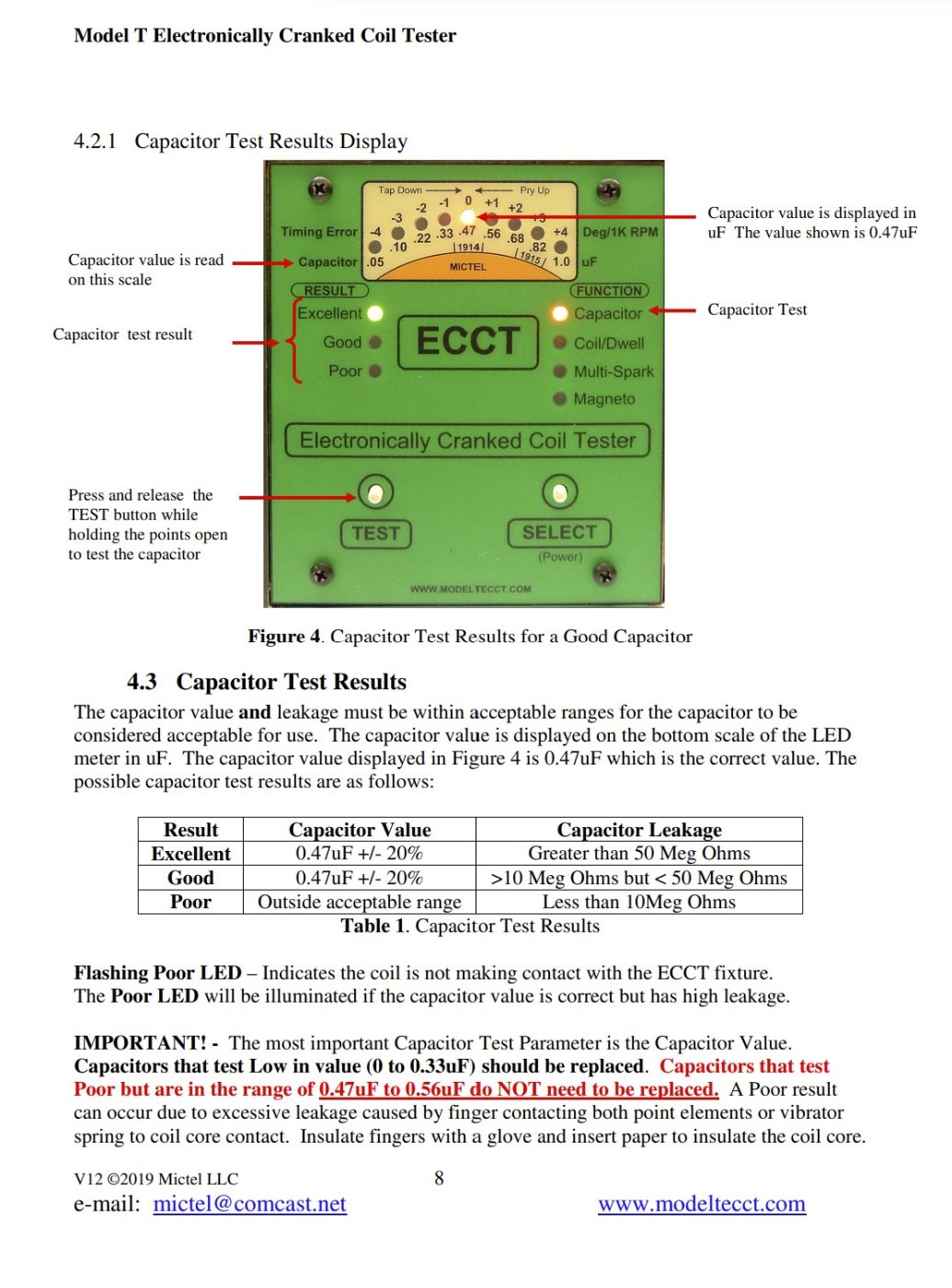 If the capacitor VALUE is 0.47uF +/- 20% and is of the correct type of capacitor (dV/dt > 600V/us) the capacitor is good for use in a Model T coil. Some capacitor test instruments (ECCT included) also test the dielectric insulating property of the capacitor in terms of leakage current which is typically very small. However, once the capacitor is in stalled in the Model T coil, there are other parallel paths for this leakage current to flow. For example, when the user's fingers contact both vibrator spring and cushion spring point elements when holding open the coil points to test the capacitor. Enough leakage current can actually flow through the user's fingers and register excessive on the capacitor test instrument.