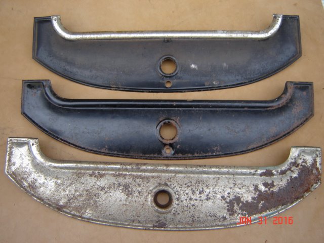 The second one has the 3 slots to crimp the trim piece in place. It does not have the side tabs like the first, and does not have the hole for the screw under the crank hole. The measurement on this one is 5 3/8". This one has the collar at the crank hole, but no hole for the screw beneath. Measured through the crank hole, it is 5 3/8" deep. Is this one for a 26 model improved car, before the screw was added to the front mounting?