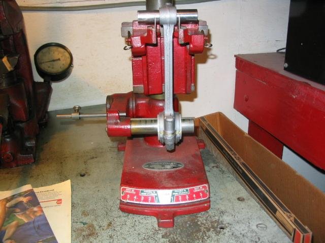 The rod pictured has no babbitt it was used for setup. The fixture clamps the rod using pins and the large bolts on either side of aviation socket head bolts, cut flat on the inside of the head to go into the rod. The long, splicing nuts are used with a gauge block to check the straight and twist of the rod.