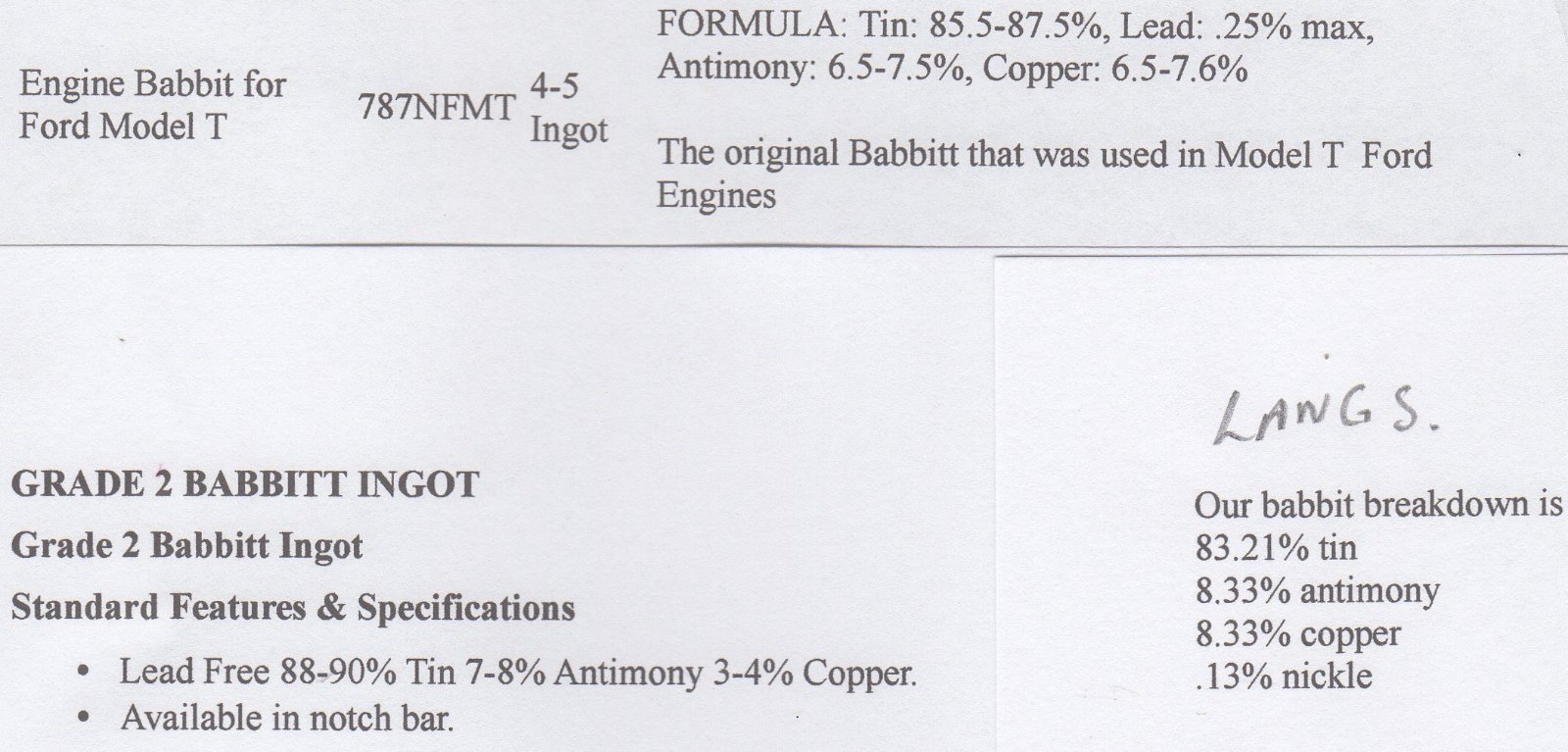 If your only doing 1 engine then buy the babbitt from the T vendors. I don't know about your area but down my way if you want babbitt from a metal merchant supplier you can only buy in bulk, which is fine if doing several engines.