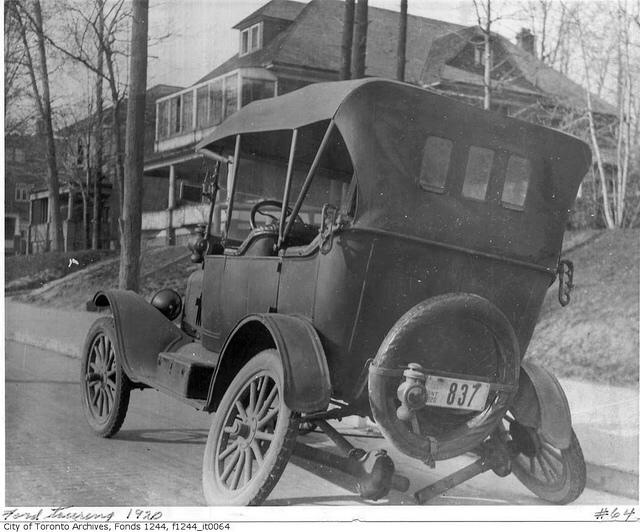 Zooming in close doesn't give much more for clues to the breakage. The license plate appears to be Ontario 1922. The car does have front door hinges, so a Canadian built car. The top sockets look like earlier oval style, later three lights on the rear of the top. Also, notice the clamping style rests for the top when lowered. The windshield is straight (Canadian cars went to a slanted windshield about late 1920), and appears to have a rear view mirror mounted onto the hinge bolts! Clearly a non-starter, non-demountable car (square wood fellies), but not much to speculate whether the car could be a late '17 or '18, or later '19 or '20 without the options.