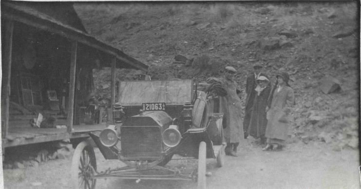 That is a 1914 Oregon license plate nicely mounted on the dashboard where it won't inhibit cooling. The rough looking background suggests an exciting excursion to me.