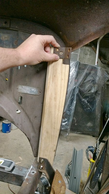 The wood dash pillar, (Thank You Mark for using the correct terminology), Does have one of the 4 bolts going through it. There is a small metal reinforcing bracket that attaches the cowl support piece of wood to the dash pillar that has a corresponding hole....a square hole for a carriage bolt. So of the 4 bolts attaching the body to the dash, the two inner 5/16 carriage bolts are short---maybe about a 1/2" long give or take. The two outer bolts are maybe about 1 3/4" - 2" in length as they go through the wood dash pillar and then through the cowl and then dash.