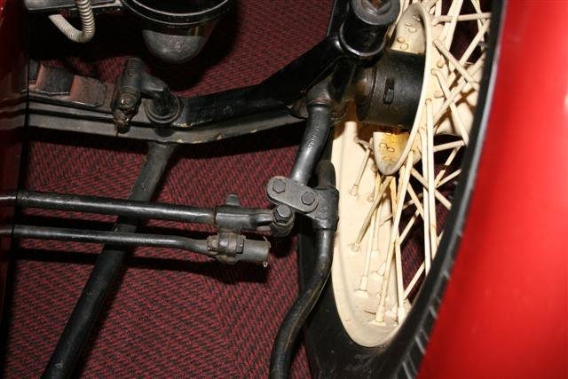 Frank, I would be wary of mounting fenders in the manner shown which features a 26-7 T wire wheel. Strap iron lacks rigidity at the best of times. The long straight section of strap from mounting point to fender gives plenty of scope for movement. Also, each of those mounting straps is free to flex in any plane on those two 90 degree twists. While the spindle arm mounting is solid and the nut will take considerable tension, that is not the case at the top of the king pin bolt. Excessive tension here will put load on the kingpin bushes, making steering tight. Leaving the king pins loose enough to cope with required steering forces will mean a less than tight mounting for the fender.