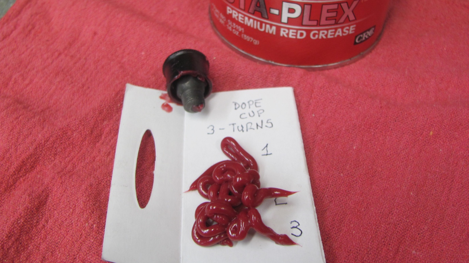 Ford Owner's Manuals state to use the dope cups, by filling and running down a 'couple' of times, to me that is at least 3 full dope cups, run down to the base......here is what 3 complete dope fills looks like in volume of grease. The dope cup base opening is larger than a Zerk, so the grease worm is larger!