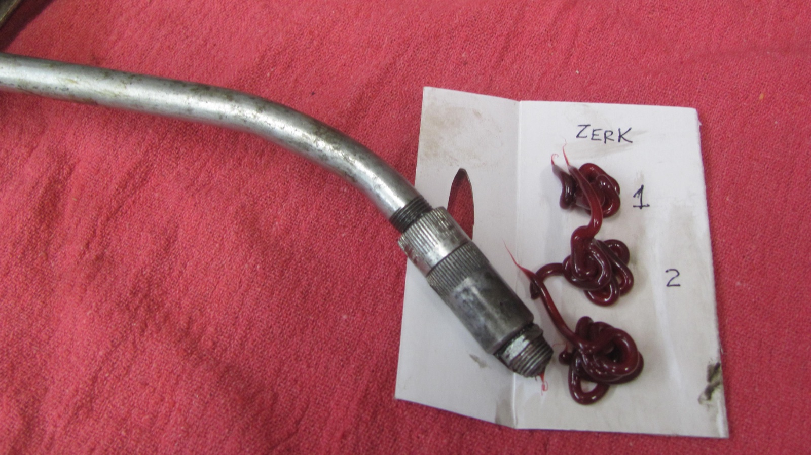 My grease gun is the typical with long handle and a full open and close passes out a small narrow worm of grease, here is what 3 pumps looks like in a small Zerk as used on Ford 1/8" pipe thread grease fittings.