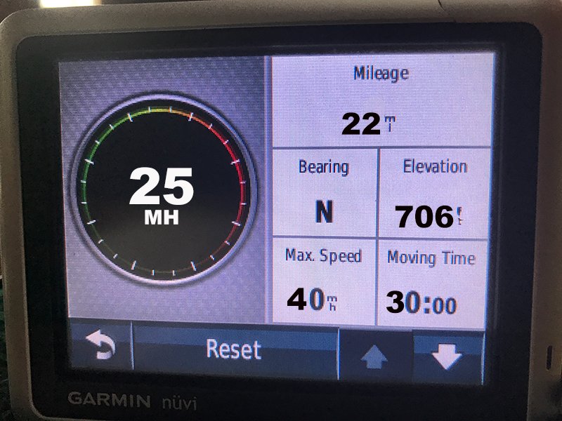 Uh-oh. Too much bouncing on a bumpy road wiped out a tail light. I think I'll give up on the trailer lights and install something permanent. The next "event" was when the speedometer died. The bike speedometers are great when they work, but all the trouble I've had with them tells me they're just too delicate for my kind of driving. I spent over an hour fixing the thing. It worked for about fifty miles, then died again. I'm thinking of a modern navigation device.