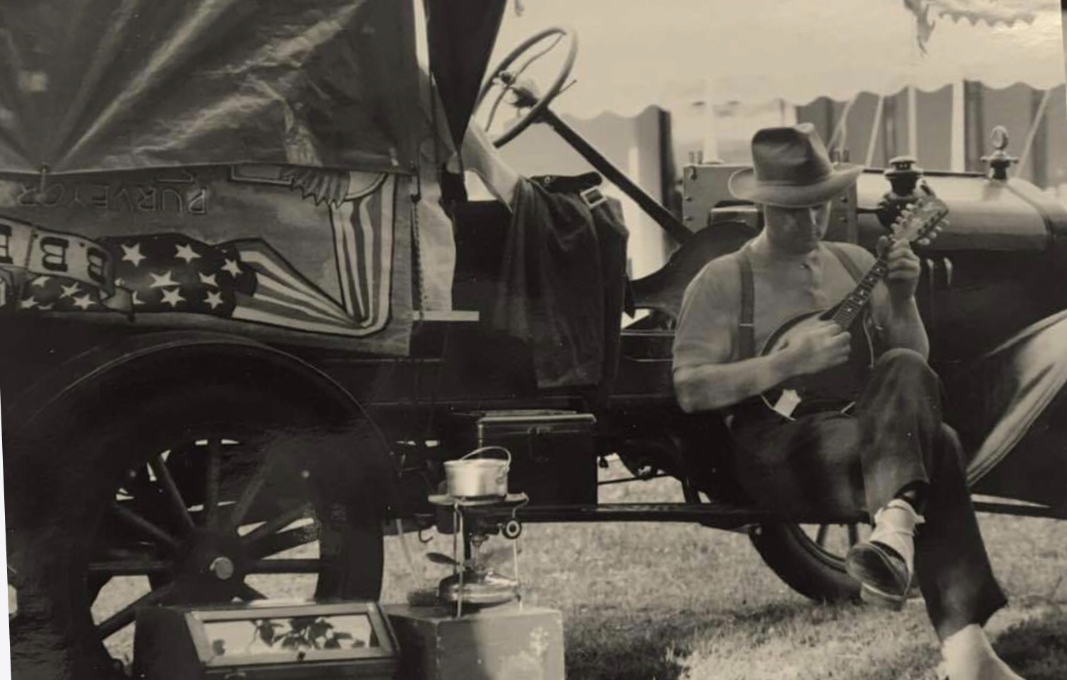 Seeing the pictures of people sleeping with their model Ts reminded me of back when I performed my traveling medicine show with the T for many years. These were two to ten day festivals and I used to fold the painted backdrop on the stage to create a tent for shelter. This shows me in the morning waiting for coffee to get hot. You can see part of the backdrop on the left. We sold Lenape Liquid ... and nose flutes.