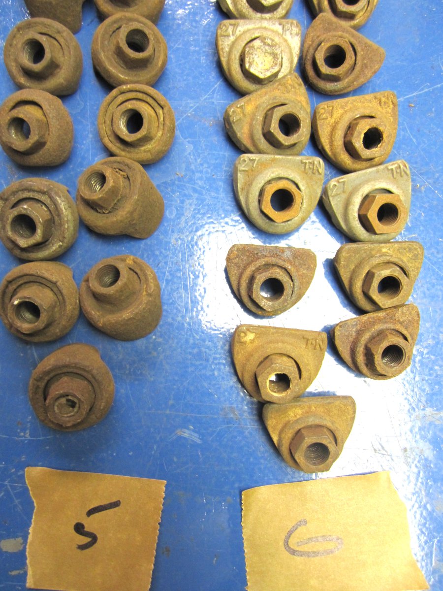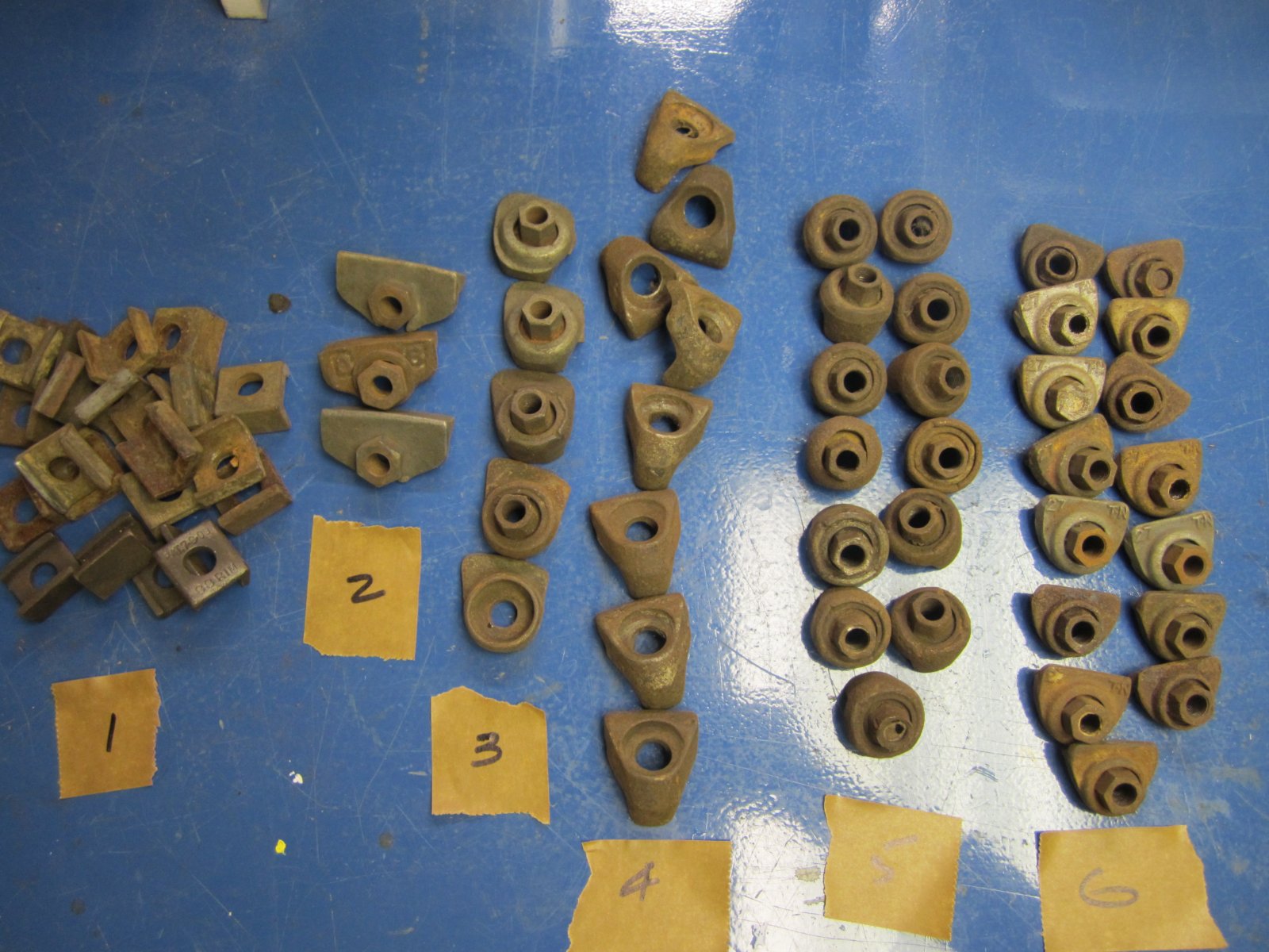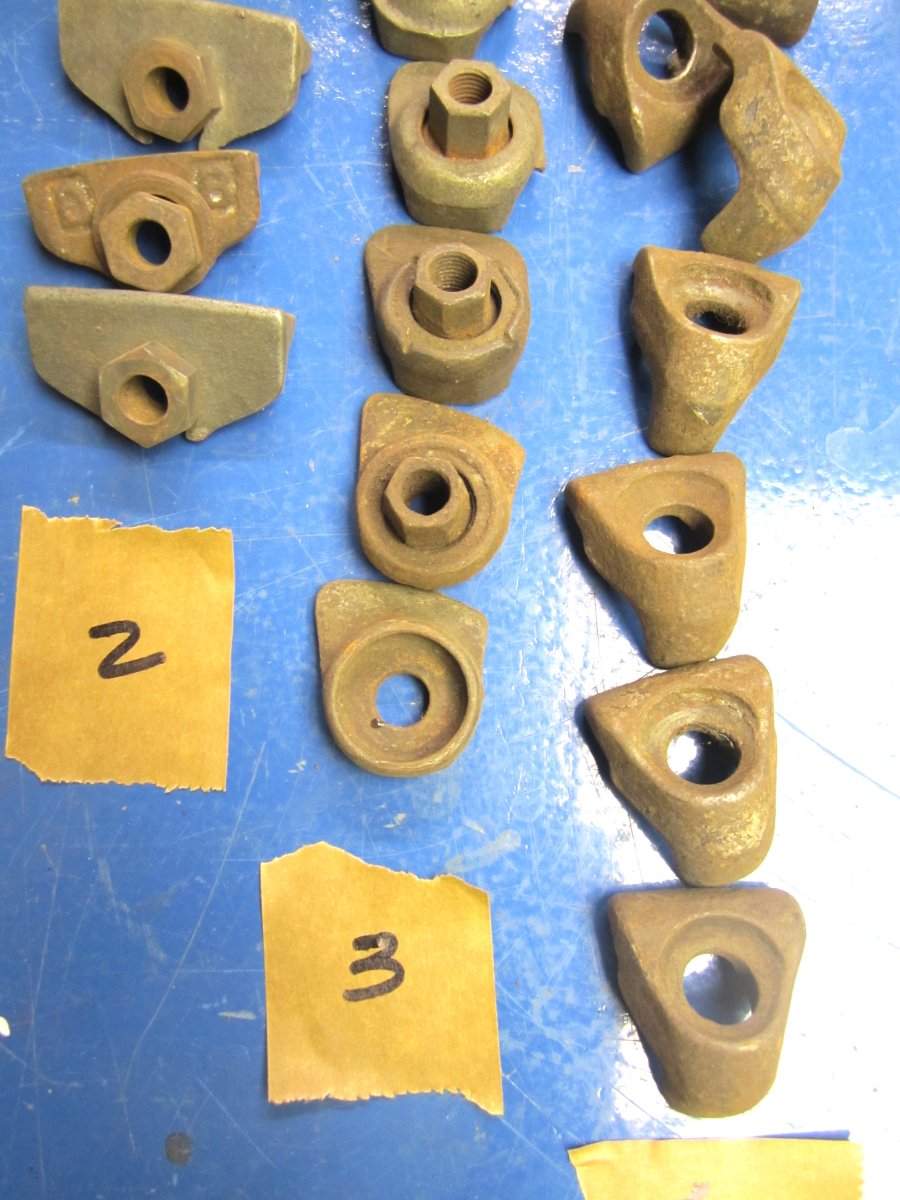 Joseph, the number ones are indeed lugs for Kelsey 88 rims. At $16 each for new, precisely CNC machined reproductions now available from the vendors, you have a small fortune in that heap! Yours are much nicer, showing minor flaws, deforming and some numbers/markings which make originals so much more interesting.
