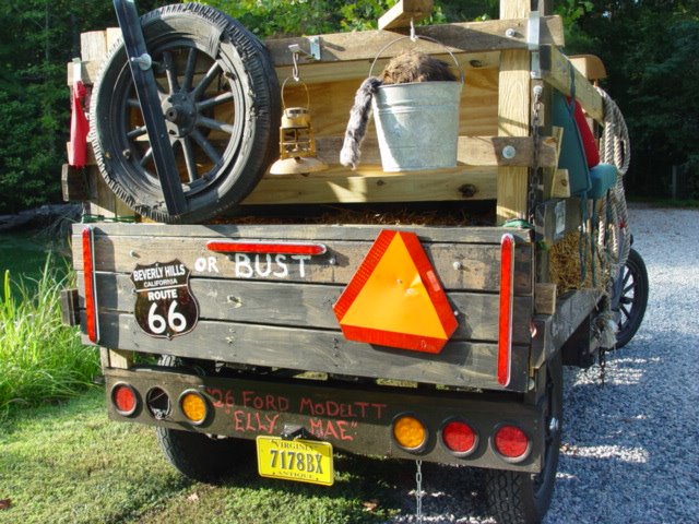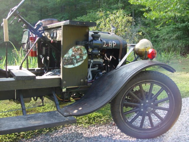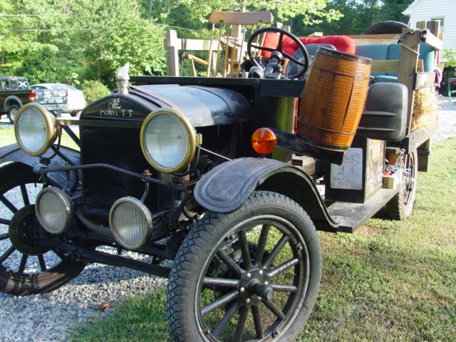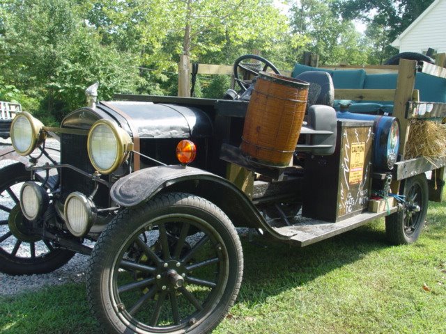 The original Beverly Hillbilly's vehicle was an Oldsmobile, someone on the Forum told me it was a '23. There is no way I would modify a really nice and rare car like that. So I used a TT frame and many parts I had collected. Basically it was a matter of getting the chassis together and running, then road safe with lights etc, then build the bed etc, then the little touches like the road kill bucket. All fun, and I feel that she is mechanically sound. I also enjoyed designing as I went along to make everything from the driver's seat comfortable to doing the wood butchery. The only thing I regret is I cut the bed a little short. It fits into the garage easier, but it limits space in the rear. But there is enough space to seat one man and seven of his small children, nieces, and nephews for a ride at C&C. The rear seat is two bales of straw end-to-end with HD outdoor cushions that were on seal. I can go on and on about all the stuff involved, but the key is I have enjoyed it, and I have not hesitated to take suggestions from others.