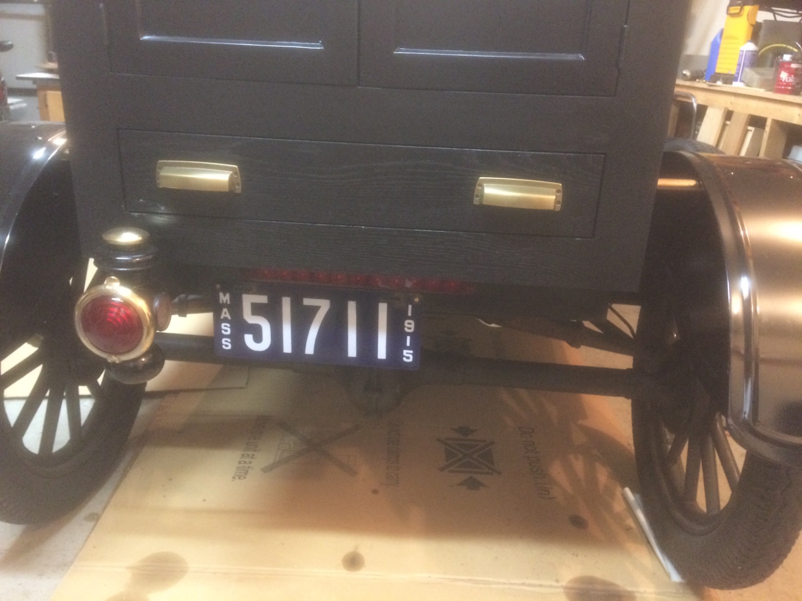 Last Wednesday night I got caught out a little too late. Was a too dark for safety sake. After that I decided it was time to add a little more light to the back of the T. I had already converted my headlight to LED’s, running off a 12 volt motorcycle battery and kept charged by the T’s magneto. Ordered up the parts Friday night and finished installing them tonight.