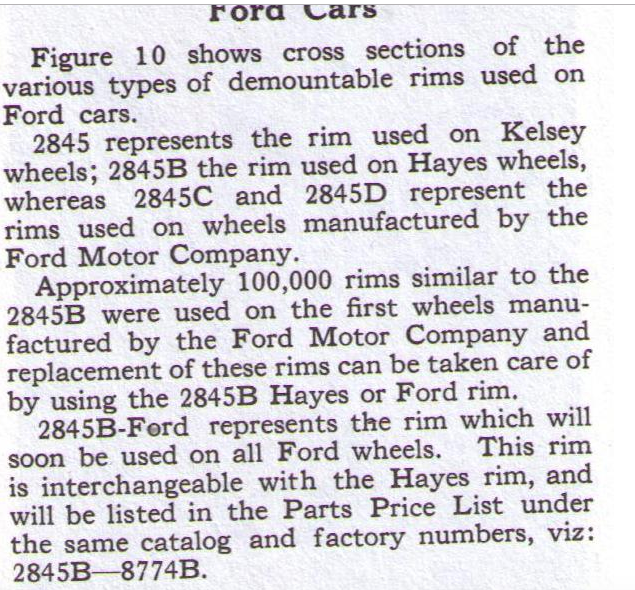 Great discussion and lots of photos of the "Ford" (mfg. for Ford by Firestone & Cleveland) demountable rim 2845D and the clamp 2846D with conical opening for the standard rim nut, 2848.