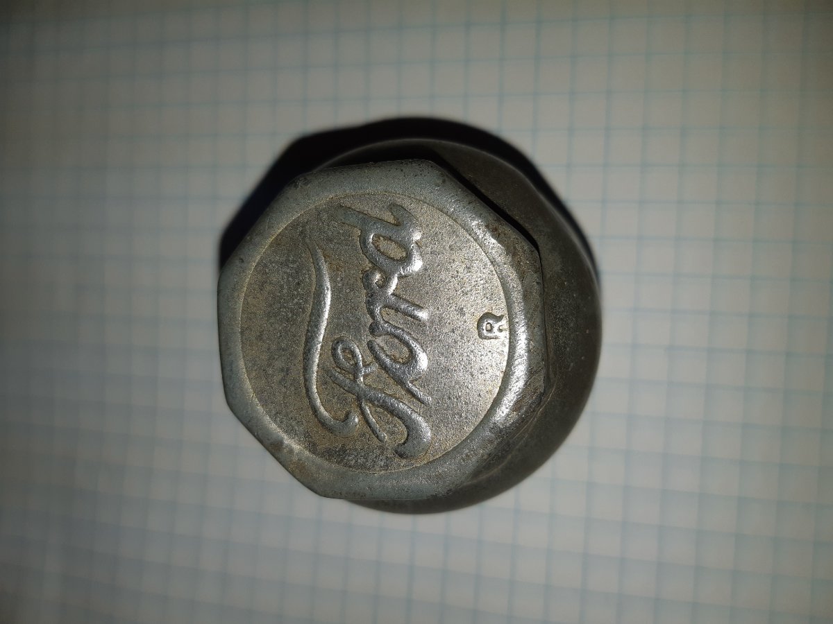 Jeff, I have its twin,[without the hole punched in the side] I put it down as aluminium, but it may well be zinc. It definitely has been nickel plated. It has the same letter R as yours. I also have a number of brass and nickel plated brass ones with just the letter under the Ford script, the letters not all being the same. Then there are the ones with Made in Canada emblazoned on them. I have never tried to assign a production date to them.