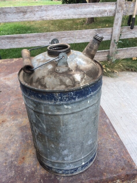 Wayne, I realized I should have noted this is a little 2-gallon can. No maker's mark. It wore a paper label for many years, I think it said Eagle Brand. My Dad bought it about 1954 when he replaced our push mower with a used reel-type powered by a Briggs & Stratton motor. For comparison, here's a 5-gallon can I picked up that was abandoned at a remote boat dock about 35 years ago. Originally it held a Sinclair Oil product. Neither cap fits the little can. The big hex-top is too big, and the one with the spout is too small.