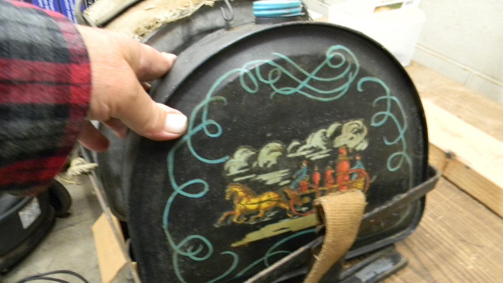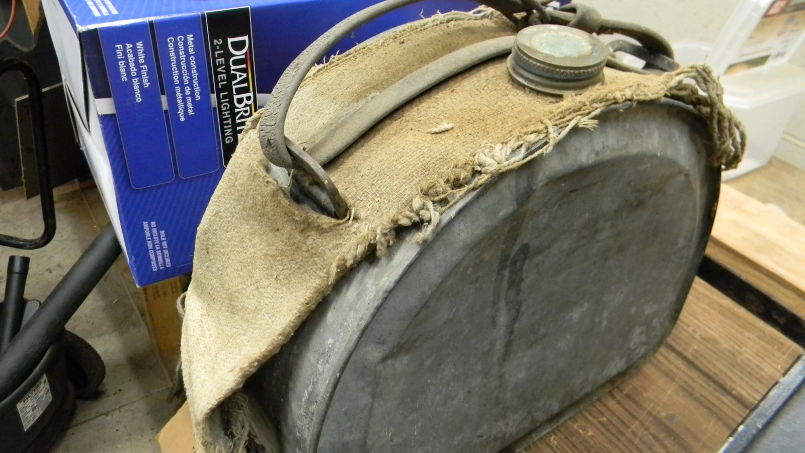When I was really little, we spent a lot of our summertime on my grandparent's ranch in Modesto, Califunny. My grandpa began to retire when I was twelve, and sold off the larger part of the ranch. Before that was a great time to be kid. Exploring the various barns, "helping grandpa with all the various maintenance issues and projects the ranch always required. There were many things to discover and ask about. Including numerous canteens, large bottles and cans wrapped in burlap or canvass. We were there for weeks during harvest time most of those years. Those canteens, cans, and bottles were carried on the various tractors, trailers and couple trucks used so that the migrant farm workers had cool water to drink. When we would walk or drive out to where the workers were, we would carry the canteens. There was an old canteen. Mostly it just hung on a wall of the tractor barn. I never saw it with a material covering, but I liked it because it looked like the canteens carried in the old cowboy movies. I would use it when we walked out during the hot harvest times. My grandpa gave that canteen to me. I still have it, hanging on my garage wall where I can see it when I walk through the garage.