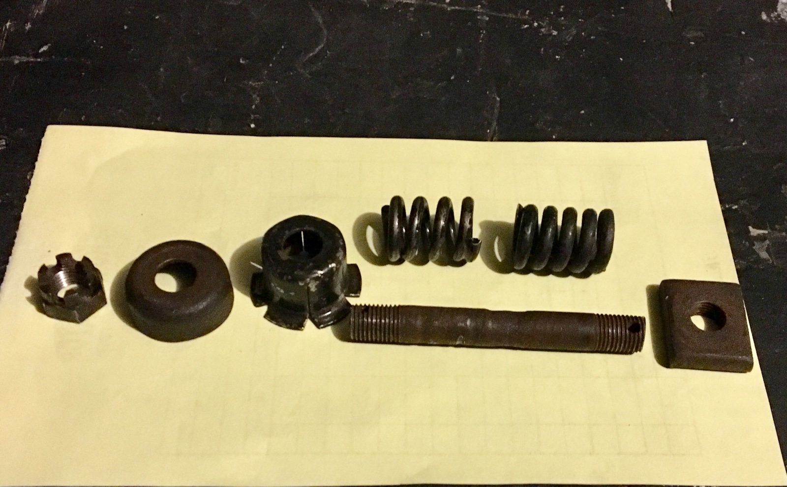 Assemble the lower portion first in the frame cavity, stud, spring, square piece, and cotter pin. Use a chisel or wedge to jack up the lower assembly for the stud to sit higher. This will help to align all the upper parts and have some length of stud to get the top nut started. Once it is all tightened up the chisel will fall out.