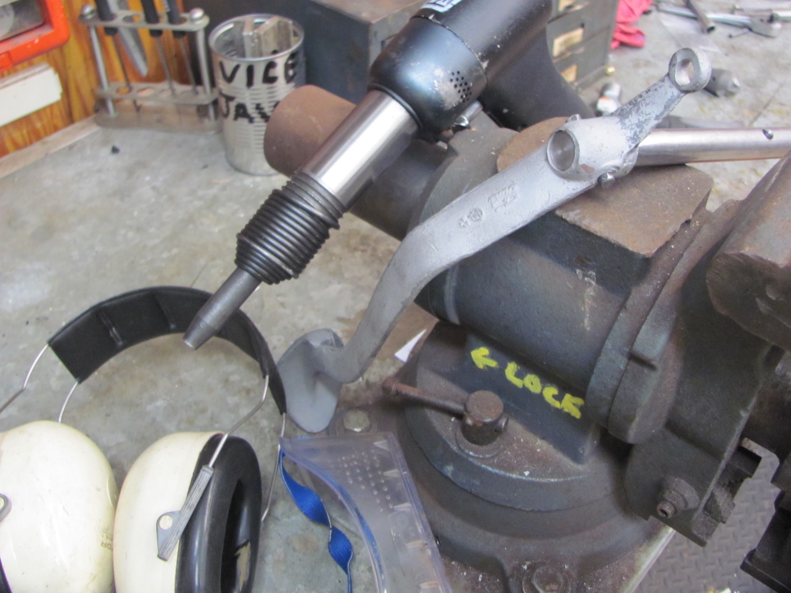 Doing this work on a bench, with a bench vise to secure for good hammering is IMO essential. Trying to hammer and drive a rivet from a wiggling low speed shaft still in the hogs head is just too much effort or satisfaction of the end result.