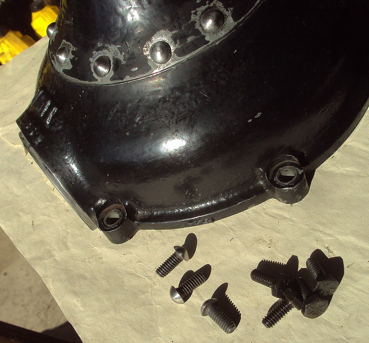 I used JB Weld on both the riveted surfaces and the interface at the housing taper to keep oil from leaking out this time. I also used grade-8 bolts and rounded the heads rather than riveting the sections together.
