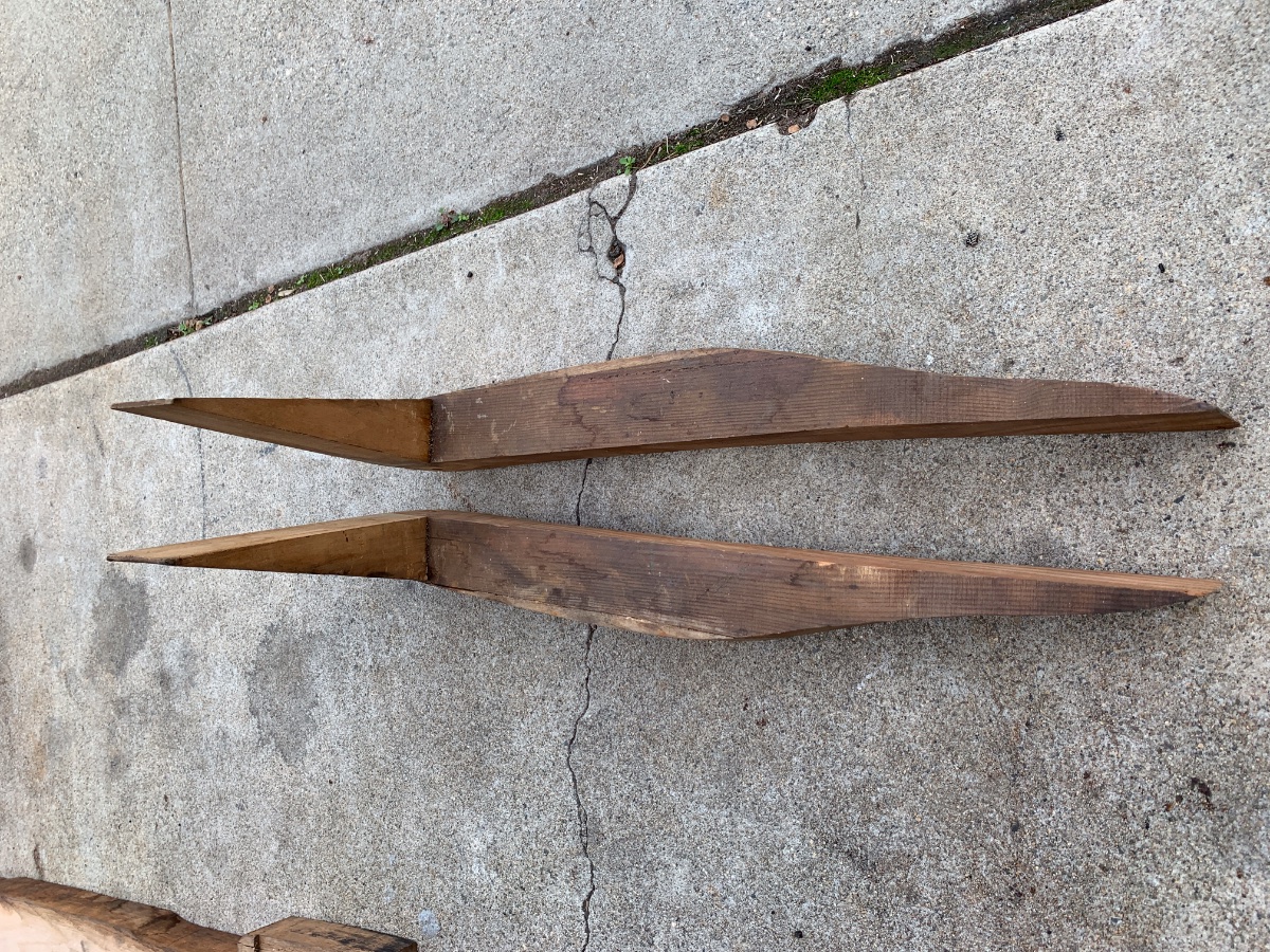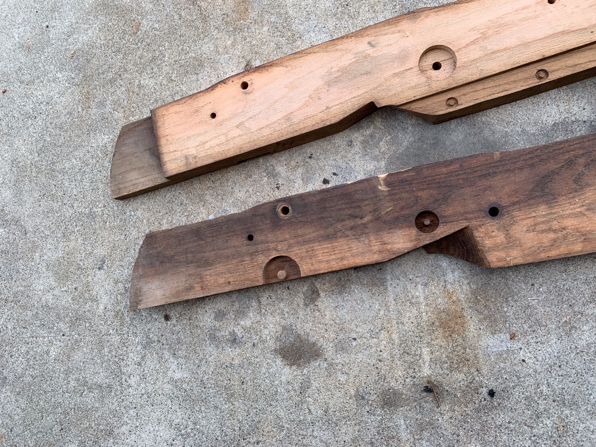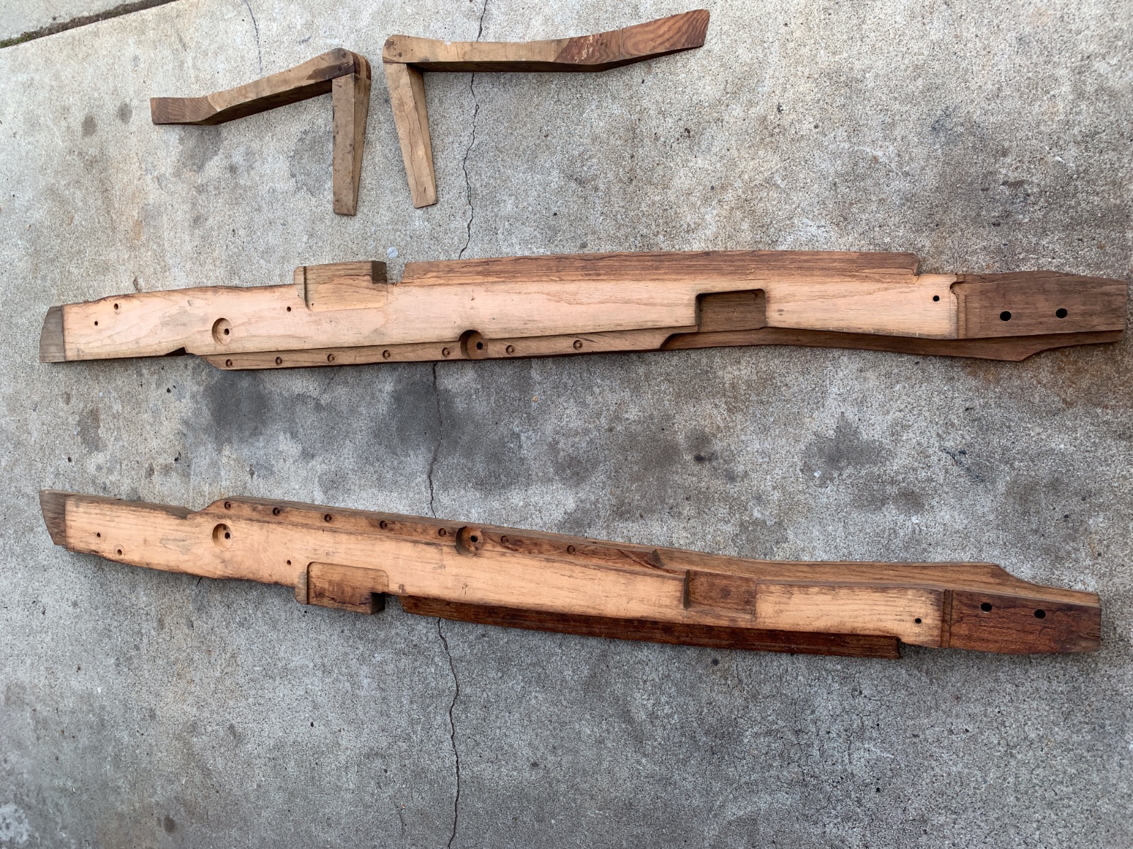 The frame rails (if that’s what they are) look like they could be for a Roadster of some kind.If you have a T measure the distance between the front and center body to frame rail mounts ,center to center. If you have some holes that measure the same distance on your wood maybe that’s what it’s for?? Just a guess.
