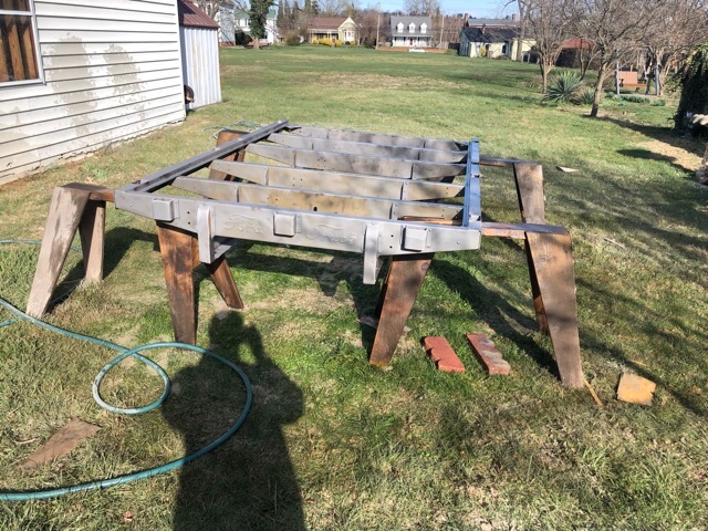 Frame and bed being blasted. I used a local guy that does dustless blasting. Nice finish surface.