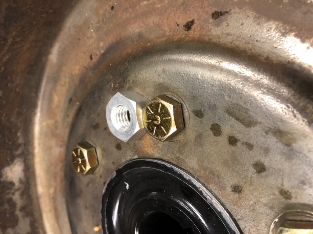 Rear wheel adapters are done! Setup to run 19” Model A wire wheels with enough clearance so that I can run disc brakes without any interference. The bolts through the back side have a shorter head than the stock nut so nothing will rub there either even when I do the final assembly with lock washers.