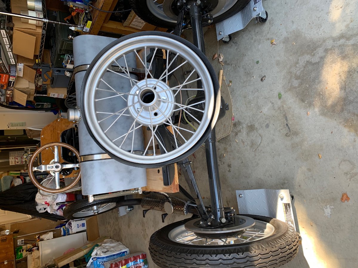 The wheel arrived this morning and was promptly installed. Having it's diameter reduced by 3", the concave dish removed and a new 14" black walnut rim (by Mr. Kevin Allen) added has given the wheel a whole new persona! I should be able to fit into my car now.