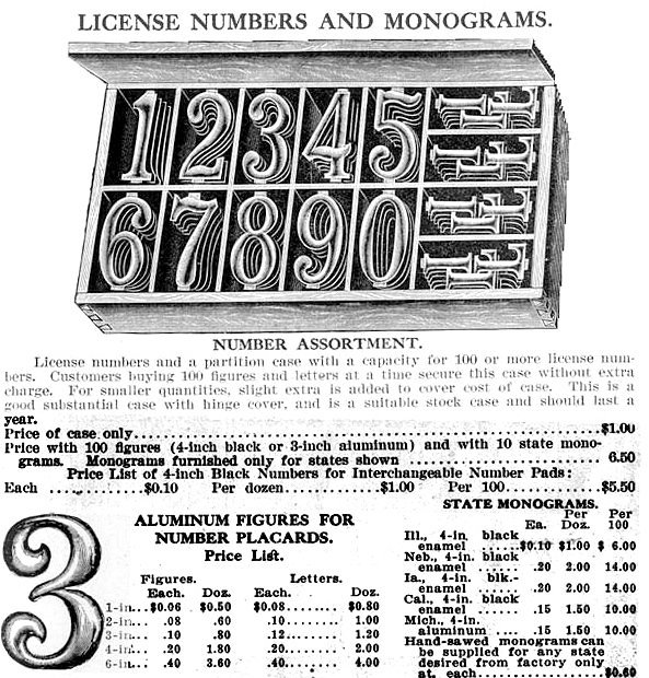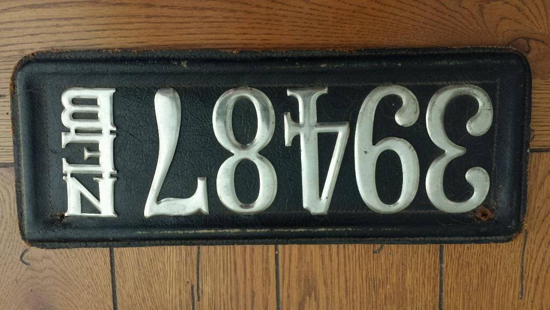 Since the owner was responsible for figuring out how to display the registration on the back of his car, there was no uniform method for doing this. If they did decide to go with a leather pad with aluminum numbers, they could make something up themselves or buy a pad and the numbers from a vendor to complete the plate themselves or provide their registration number to a vendor who would make up a plate for them, etc.
