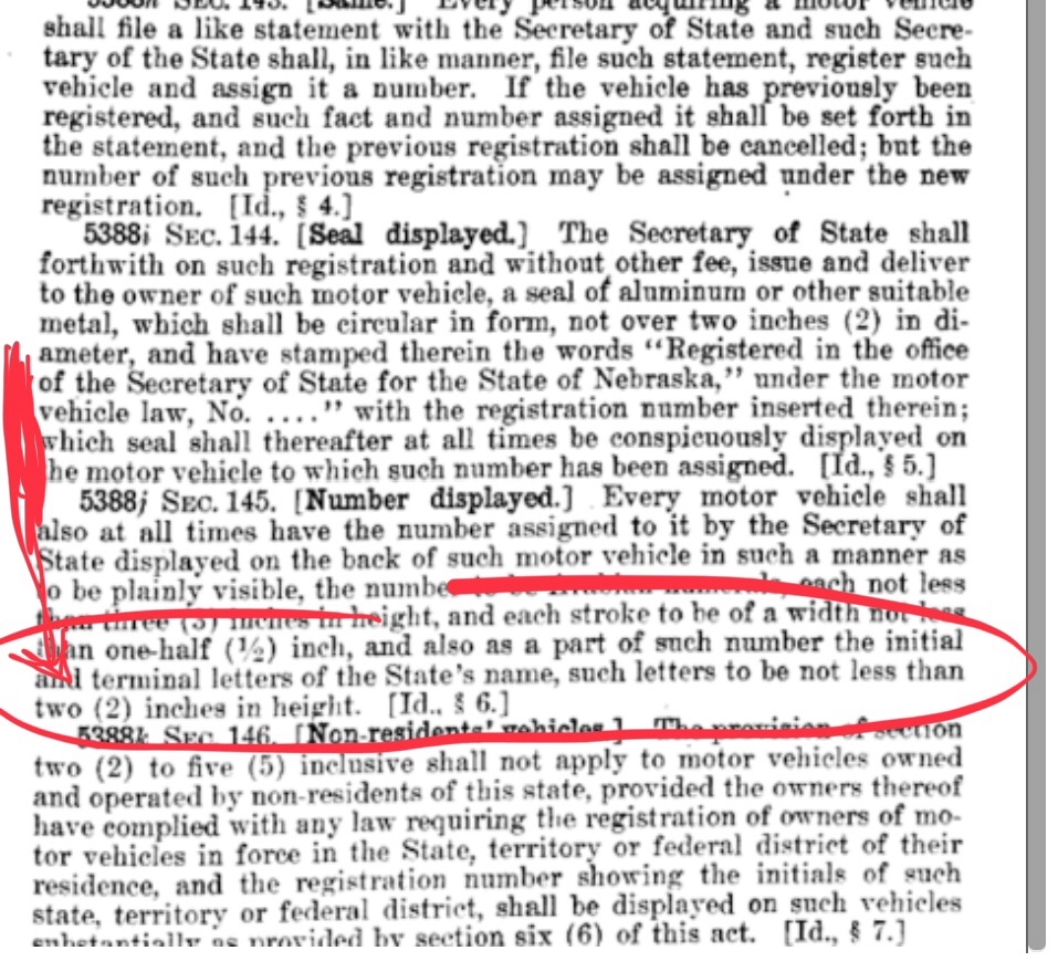 18142 corresponds to 1911. The 1911 statute revised the minimum height of the numbers from three to four inches. The "NEB" is not compliant with the 1911 statute as the letters would need to be three inches minimum height.