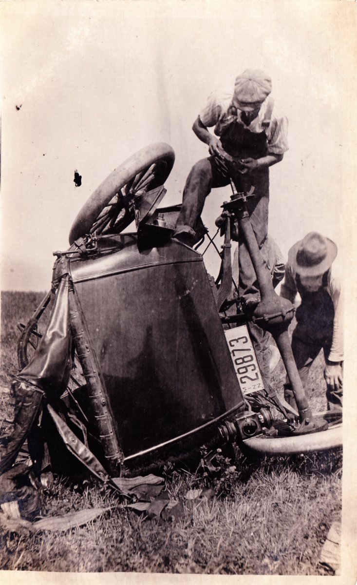 Recently found an interesting batch of photo postcards showing the wreck of a 1914 touring. The car looks to have been rolled over and was apparently hauled somewhere, rolled onto its side and stripped for parts. It's an interesting series of cards.