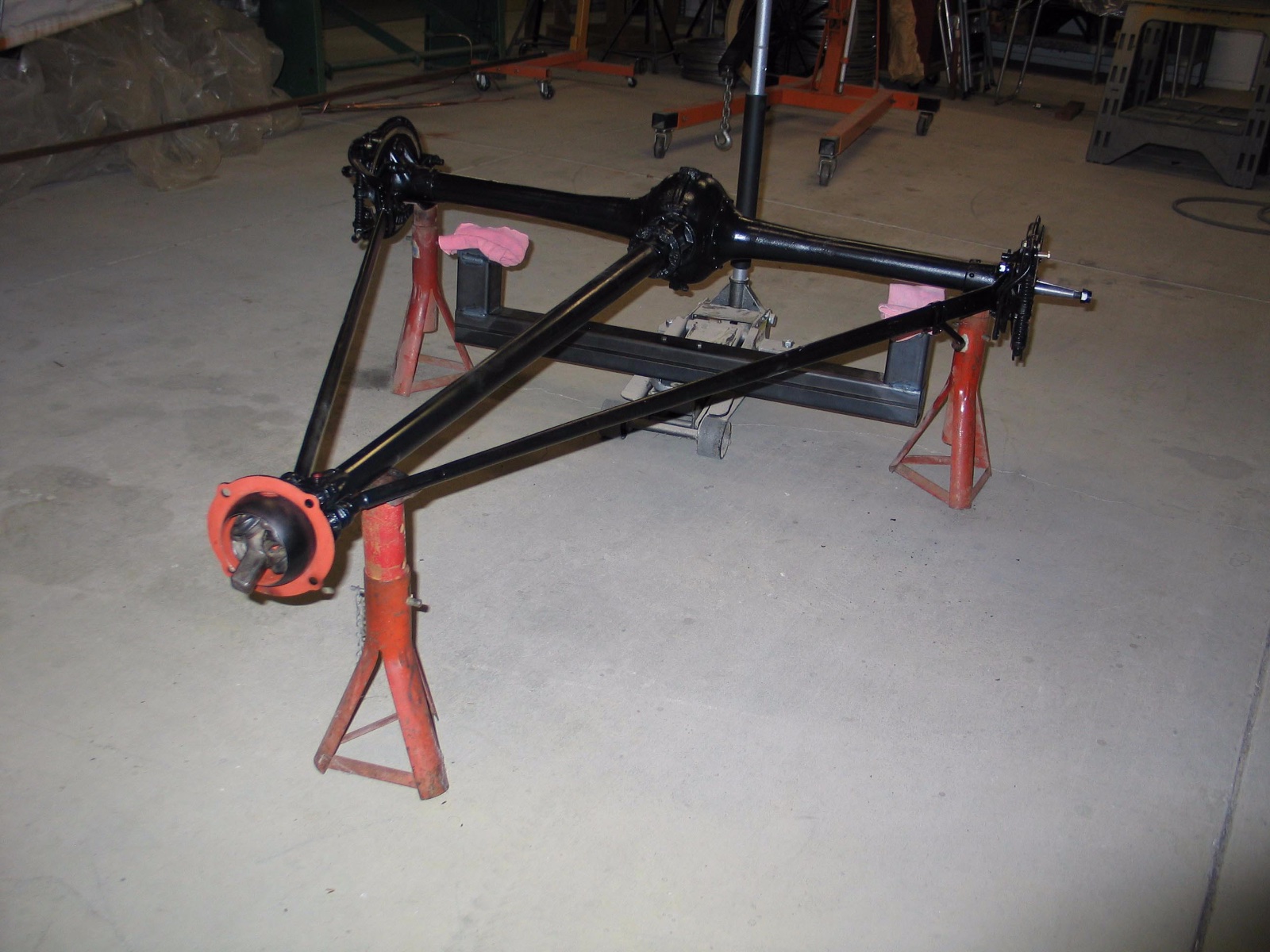 Personally, I prefer the overhead approach to rear axle removal. I built an overhead beam out of doubled 2x6s for my vintage chain fall. It could also serve for pulling the engine. Timber is handy and easy to make into needed garage items. The axle support on the floor jack is a 4x4 with appropriate additions.