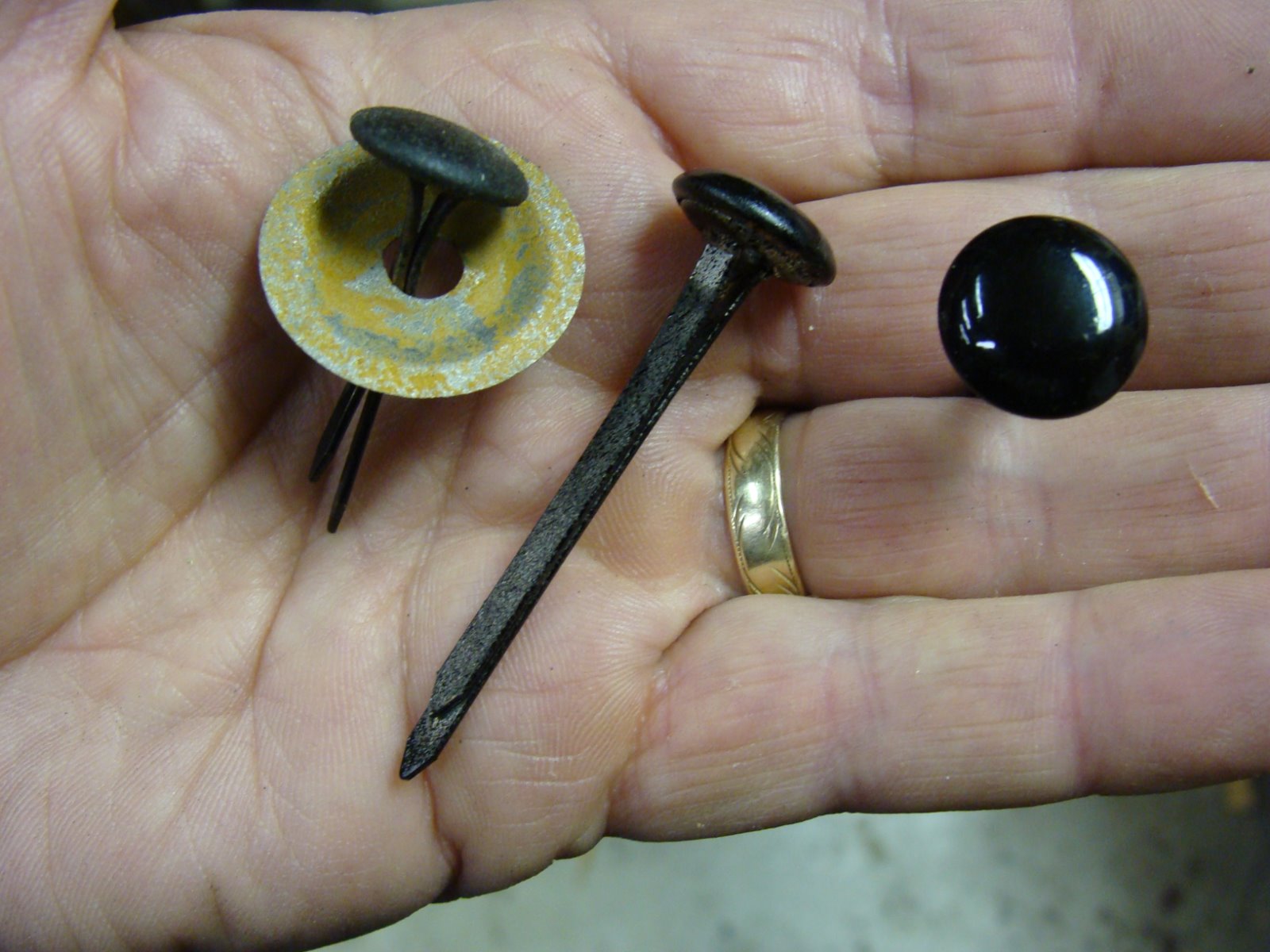 Thanks for all of the great info.... I didn't know the buttons we're metal topped. I found my button making machine and was ready to start cutting leather plugs to make the buttons. So black painted top pronged buttons we're used originally?