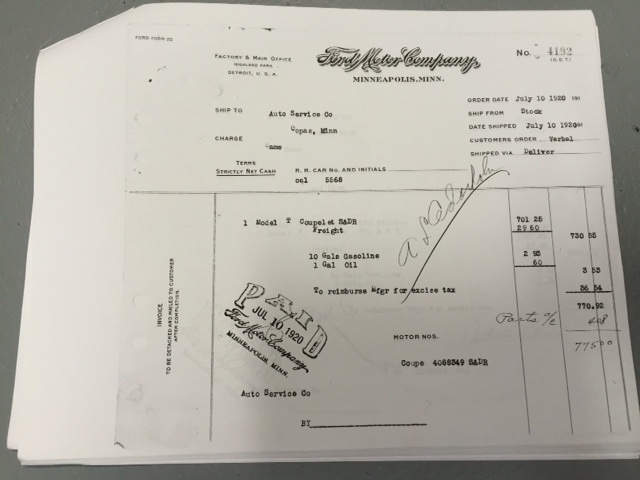 I have a friend who has approximately 20 invoices of T's sold through Auto Service Company of Copas, MN. He allowed me to make copies. Hopefully someone will have one of these cars. Most all list the name of the original purchaser of the cars. Some invoices have two or three cars listed on them. Here is a picture of one of the invoices.