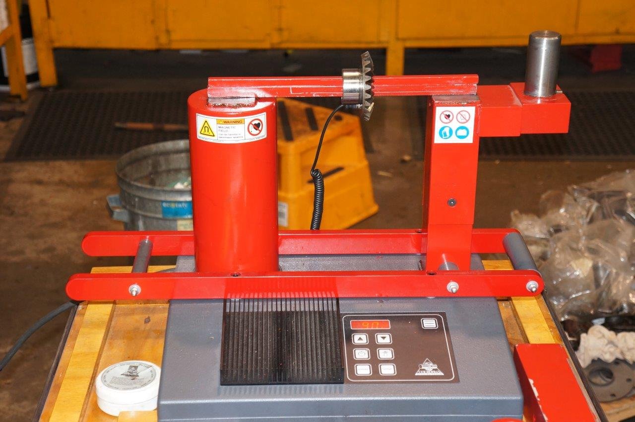 Here's the setup to install the gear on the shaft. I use a bearing heater to heat the gear up to 115°C and a freeze spray to shrink the shaft. The photo of the frosted shaft only shows the top area being cooled. I apply the freeze spray for the full length of the gear location.