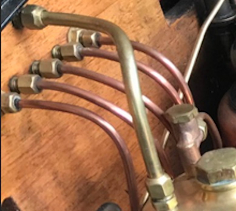 Steve, the brass tank is an oil reservoir pressurized by exhaust gas. Oil is fed up to a valve block where drip rates are set. one for each cylinder and one for the transmission ball cap.