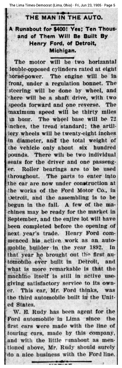 This is the first public comment/article I've seen regarding the upcoming Model N. The new model is reported to be priced at $400 (came in at $500). While the "two horizontal double opposed cylinders rated at 8 horsepower," was off, there are many tidbits here that do make it to the final Model N. This article appeared in the Lima Ohio newspaper, so this information was being circulated outside Detroit. At this point Ford Motor Co. is finishing off the main sales period of fiscal year 1905, and issued the second 100% dividend to FMC investors, so the future looks bright. FMC will also move into the top five automakers in the U.S. by the end of the 1905 sales season. Click on the article to see a higher resolution copy: