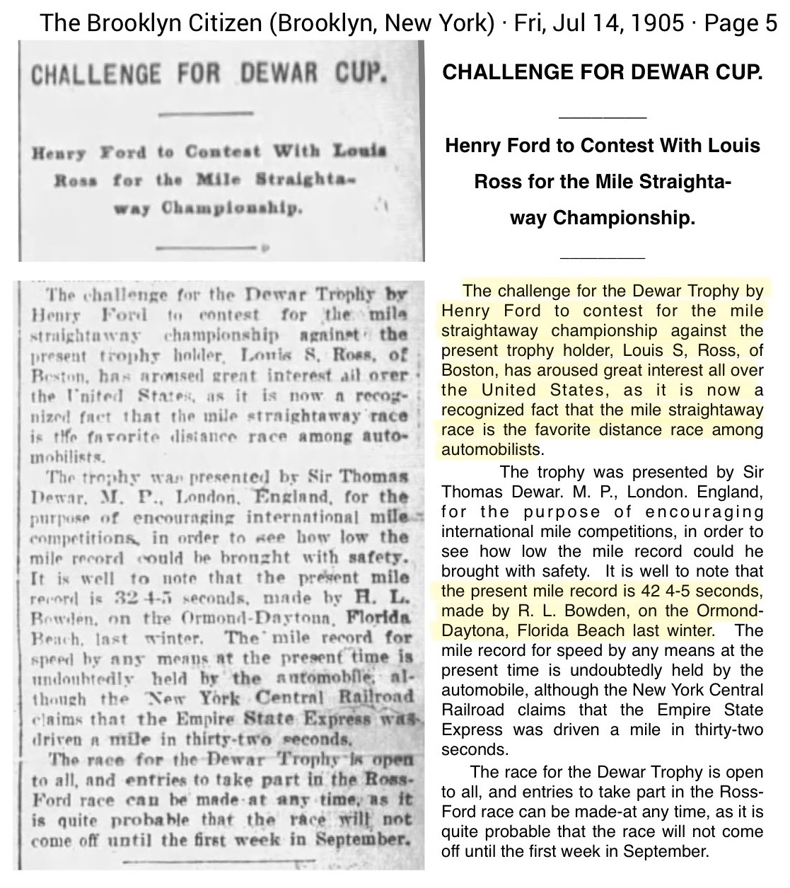 Henry Ford challenged Ross for the Dewar Cup as stipulated by the rules, and Walter Christie, inventor and driver of the Christie Special soon joined the challenge in the spring of 1905. Ford had hoped to challenge for the trophy as well as world mile record at the Ormond (Daytona) Beach Races in early 1905, but a broken crankshaft prevented him from participating in the races with his new six cylinder racer.