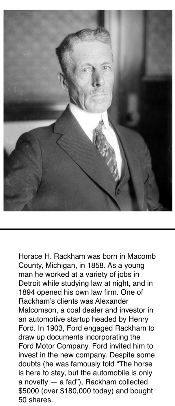 Horace Rackham, one of A.Y. Malcomson’s attorneys along with partner John Anderson were two of the original investors in FMC. In this 1923 interview Rackham talks about his investment, Henry Ford and other details about his involvement with the company form its start.