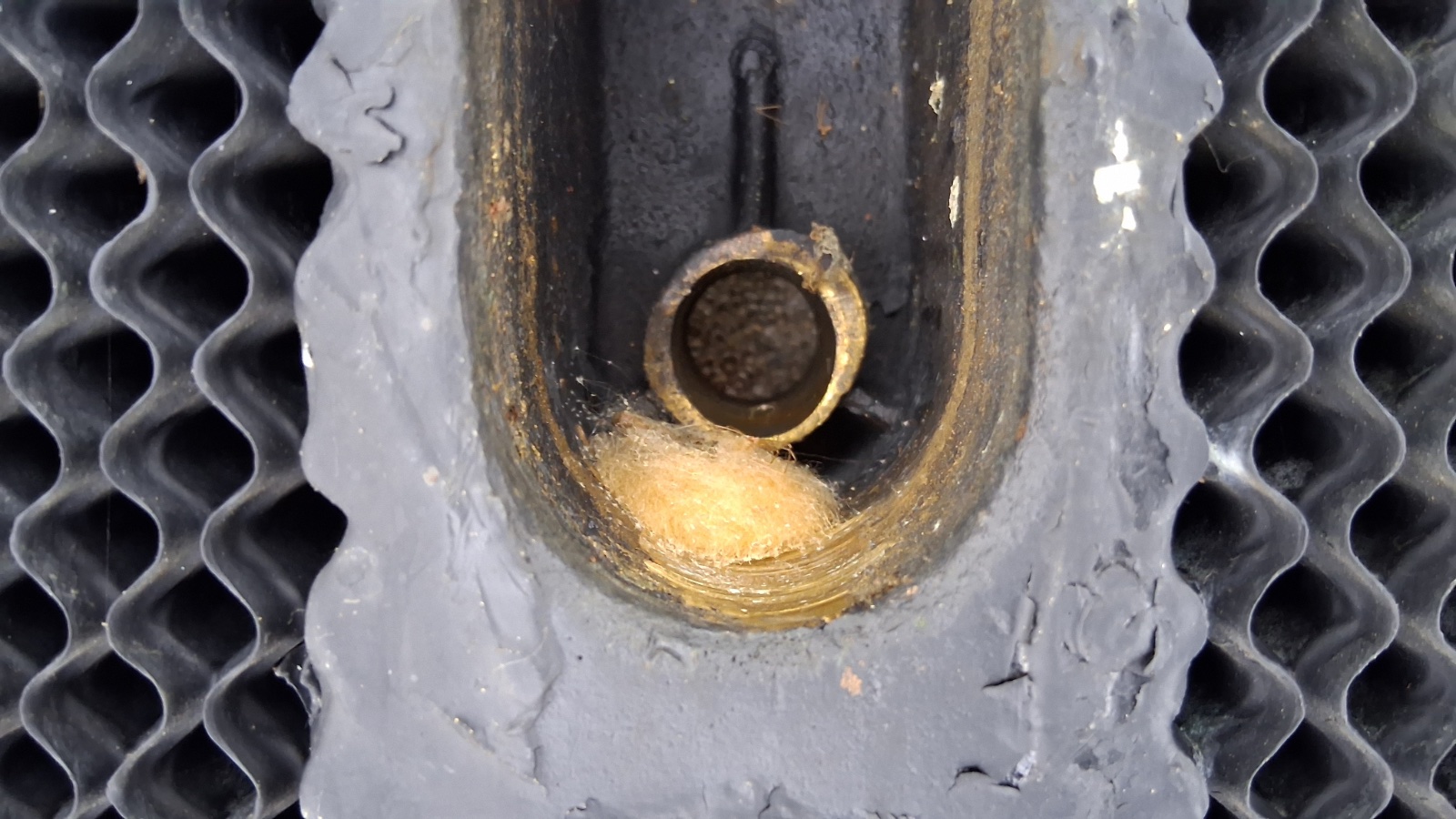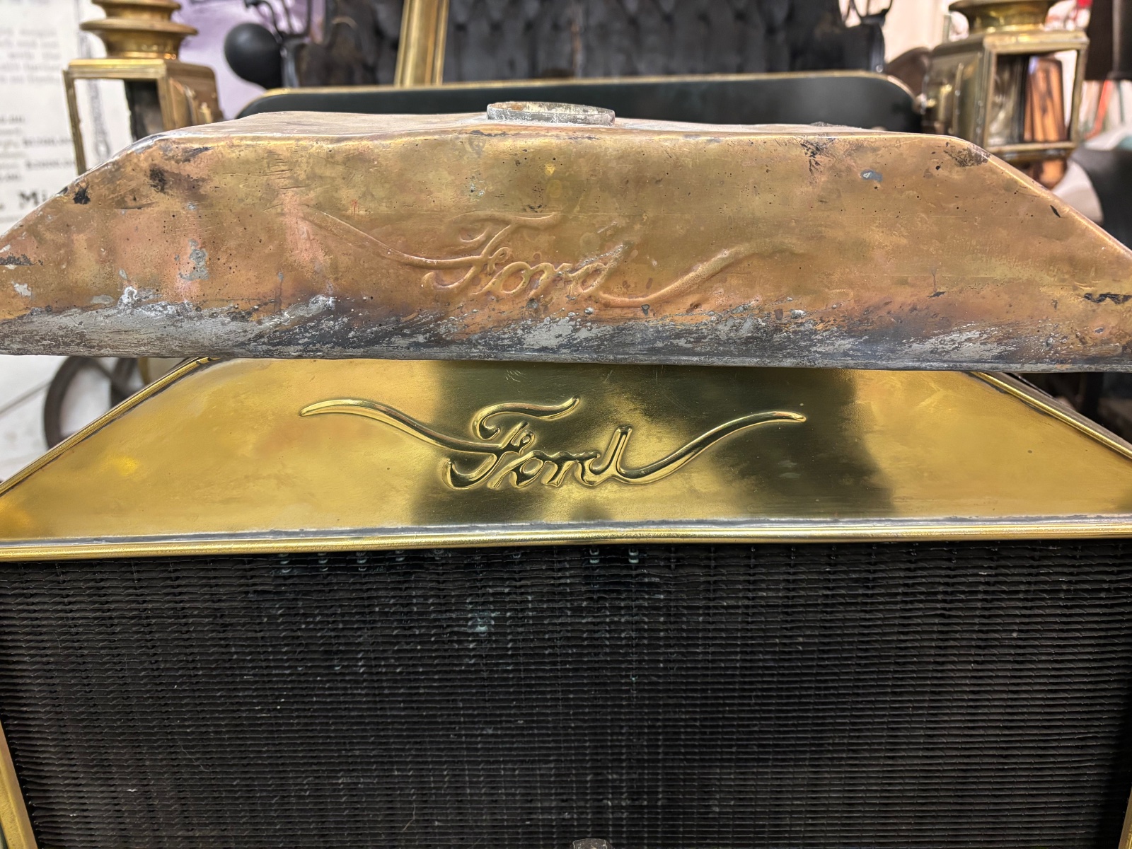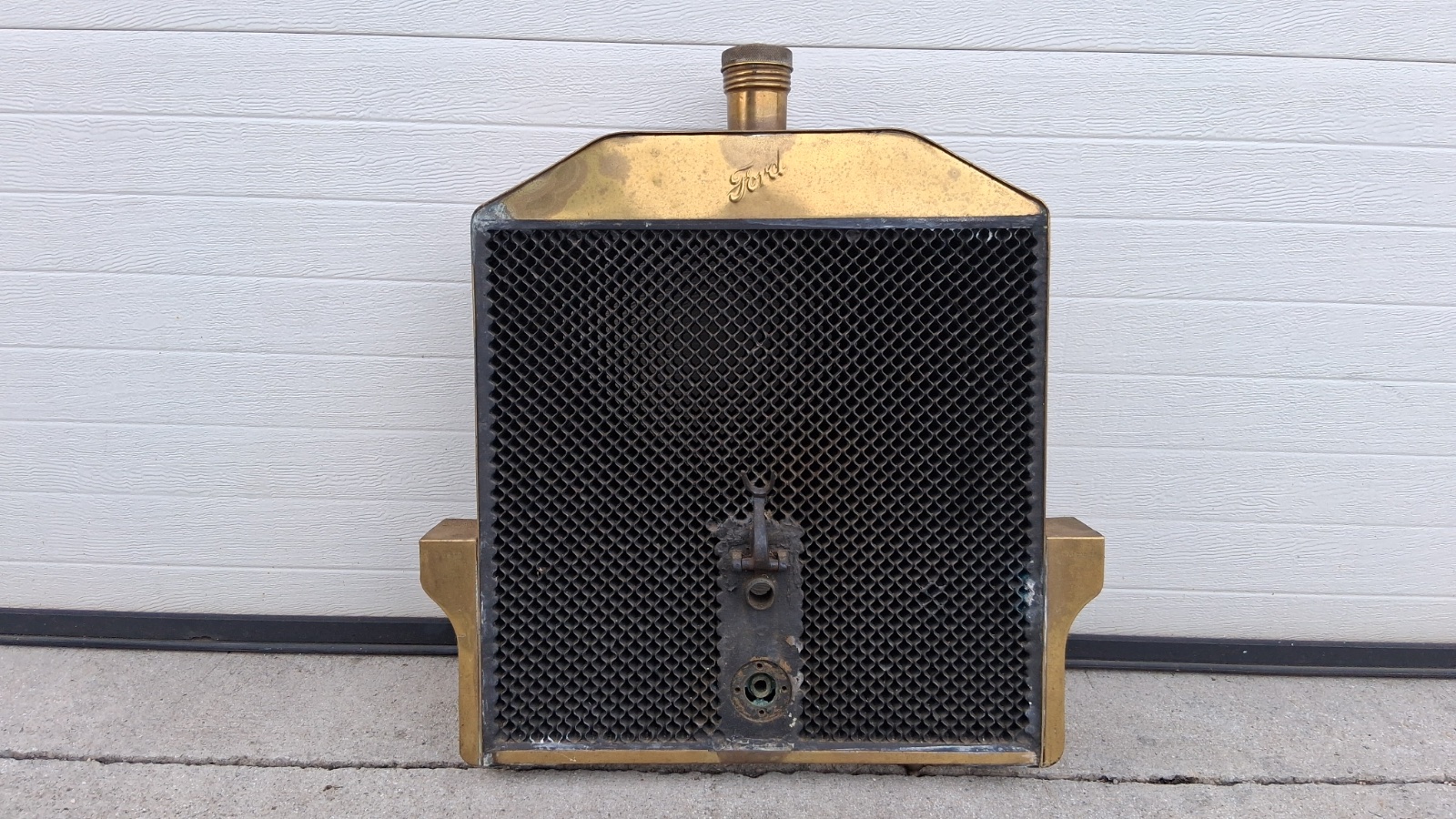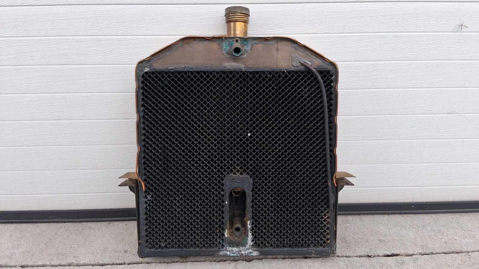 Below is a photo that my notes say Trent took of a very early Model N radiator that was hanging on a garage wall. It may very well be one from an N in the photo above. (OK that is a real longshot…) Note it also has the seam at the top tank.