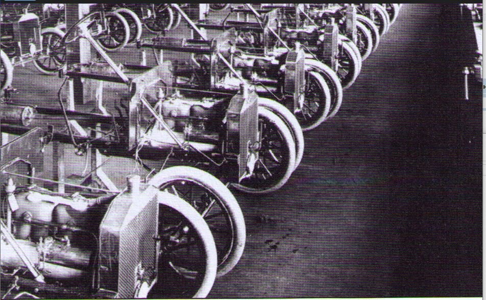 Below is a photo from the Piquette Plant floor (I believe sometime in 1906 – but I don’t have my notes available). Note form memory I believe Trent said it shows the Model N with the very early radiators. They are a honey comb design. (note – I don’t have a high enough resolution copy to tell the type of core. If someone else does, would you please post it or send a copy of it to me. E-mail address via the forum should work. Just click on my name). You can tell they are Model Ns by the Force Feed cylinder tank on the right side of the engine and if you zoom in you can see the step plate for getting into the car behind the first chassis. I’m 80% sure that same photo was used in the Model R Sales brochure – but again I’m going on memory. (Books are stored due to home renovation.)