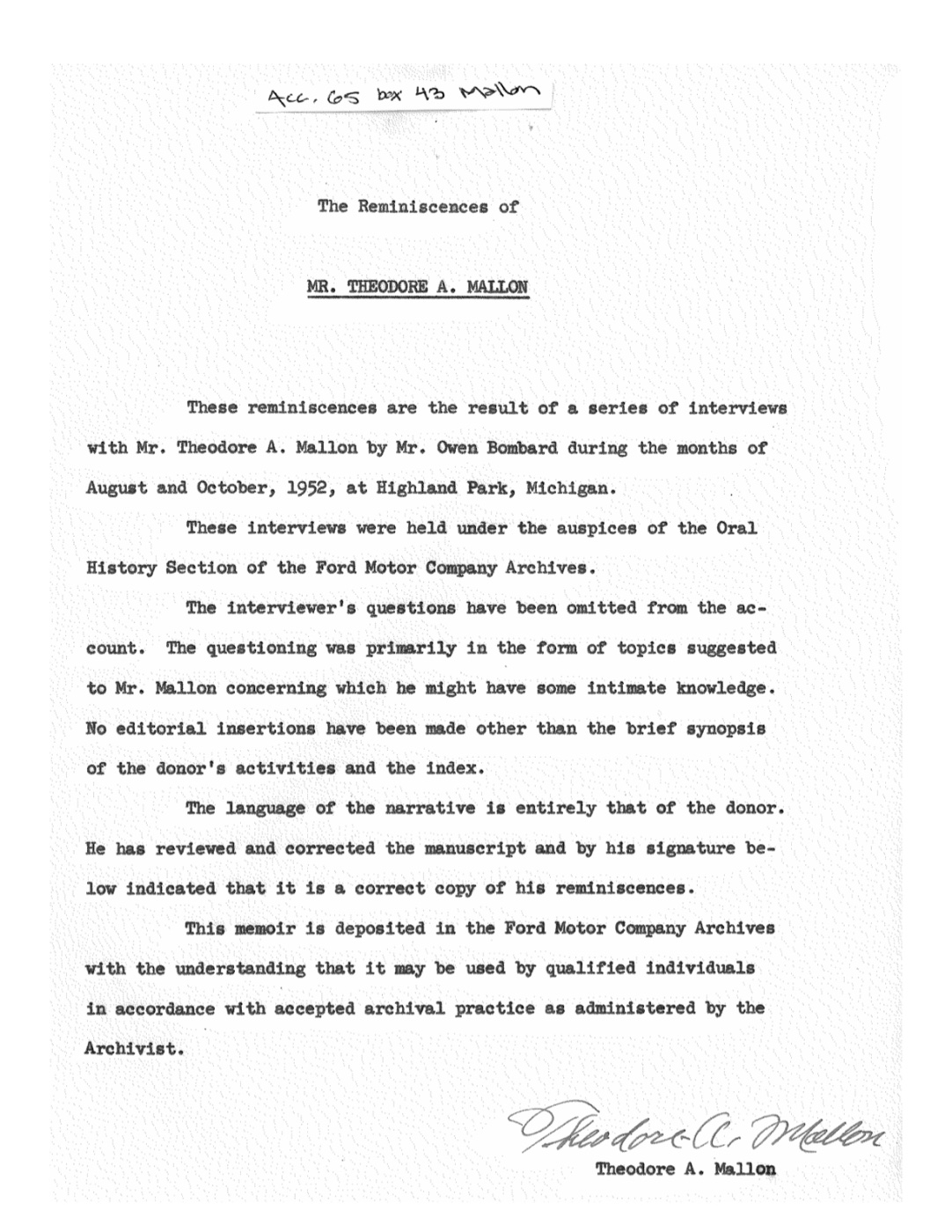 Theodore Mallon was a Ford six cylinder tester. His recorded experiences included attending the 1907 twenty four hour race held at the Michigan State Fairgrounds in which the Model K set a world record, testing Model K, and witnessing the last sale of Model K in 1909. Below he describes Henry Ford and Frank Kulick finding him and two other testers at a local saloon while testing their Model K: