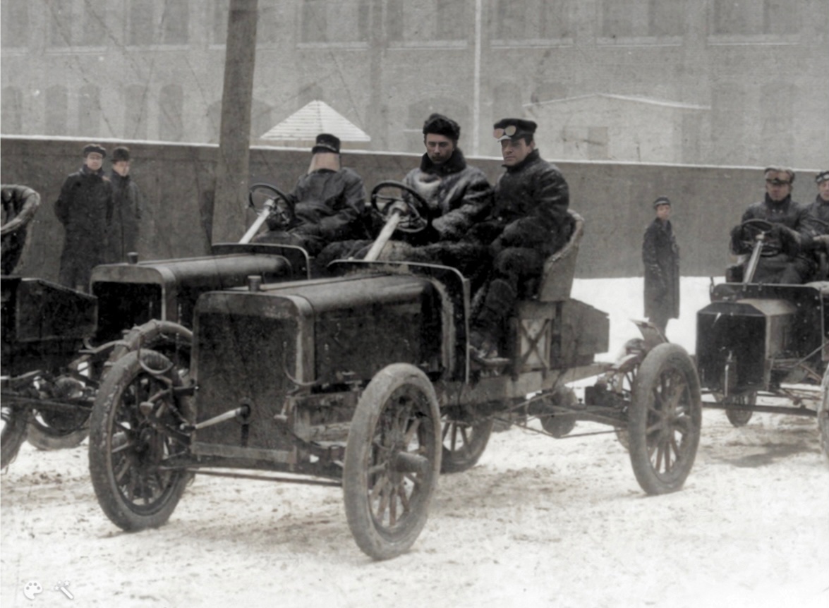 Ford head tester and race car driver Frank Kulick leading Model Ks and Ns away from the Piquette during the winter of 1906-07.
